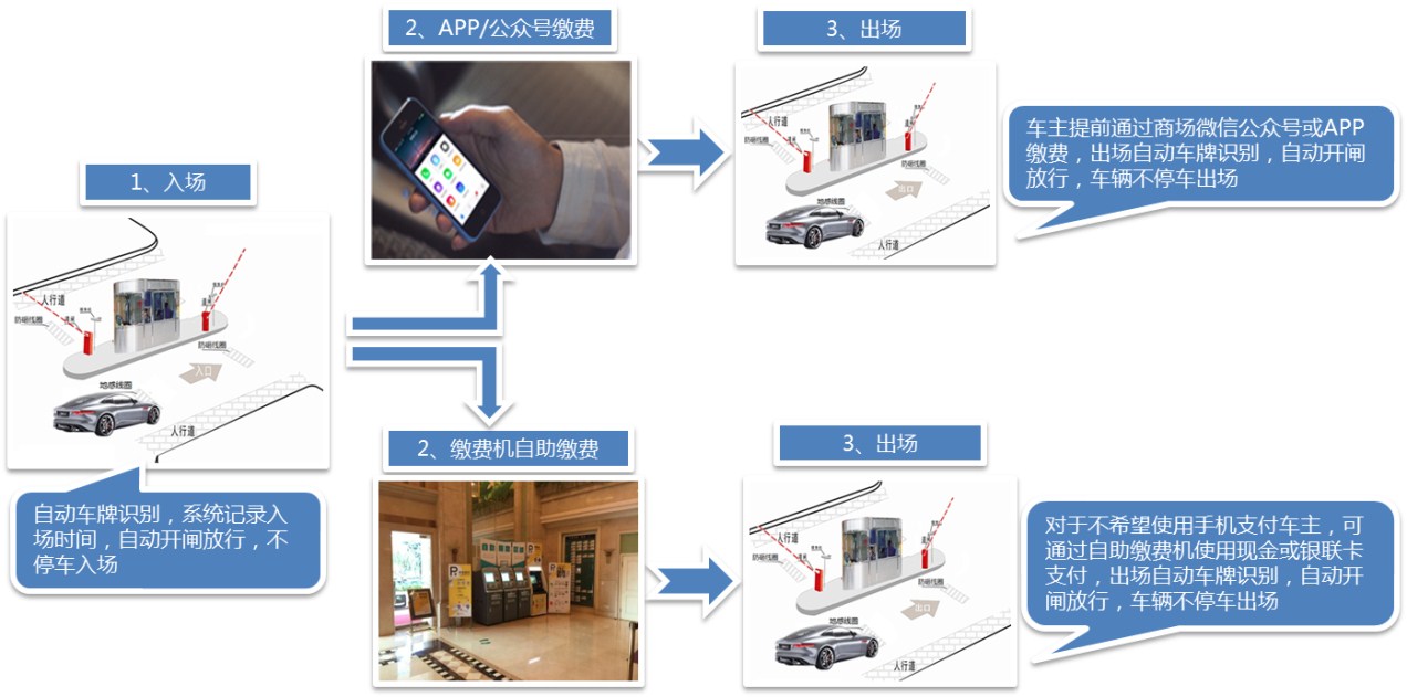 臨時(shí)車輛車牌識(shí)別不停車進(jìn)場,手機(jī)/自助繳費(fèi)機(jī)自助繳費(fèi)后不停車出場,給臨時(shí)車輛帶來極佳的停車體驗(yàn)。