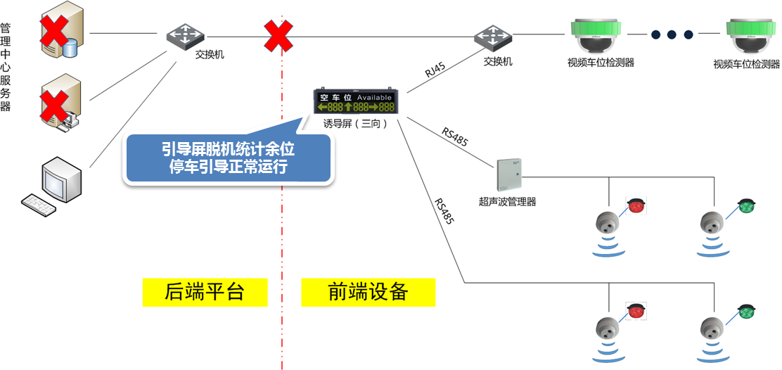 管理服務(wù)器故障或網(wǎng)絡(luò)異常時(shí),引導(dǎo)屏脫機(jī)統(tǒng)計(jì)余位,停車引導(dǎo)系統(tǒng)仍可正常運(yùn)行。